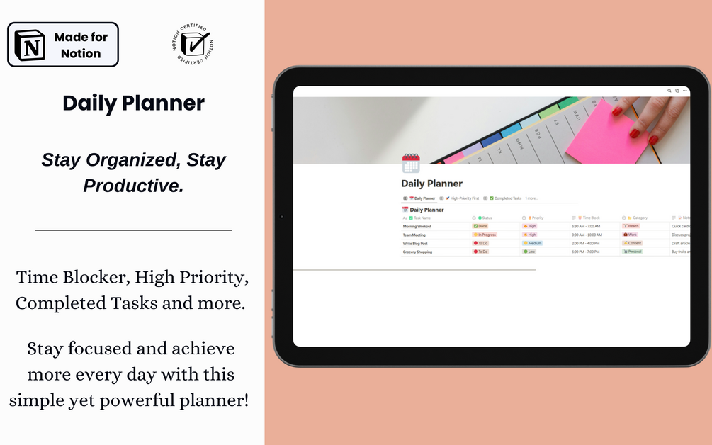 A clean and effective Notion Daily Planner to organize your tasks with ease. Includes smart views for prioritization, time blocking, and tracking progress—all in a simple, ready-to-use format.
