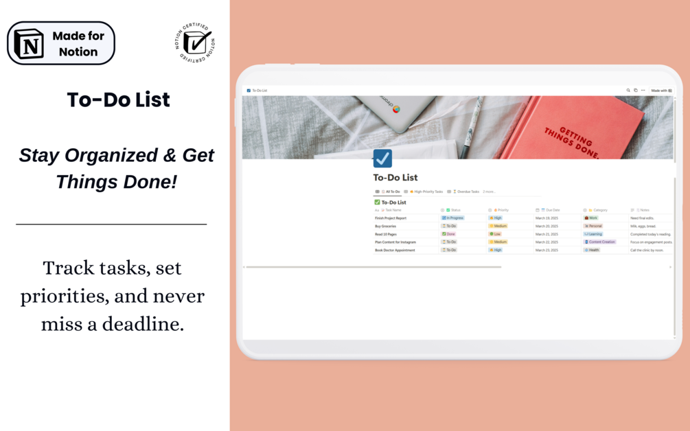 A fully customizable Notion To-Do List template with task tracking, priority filters, and deadline management.